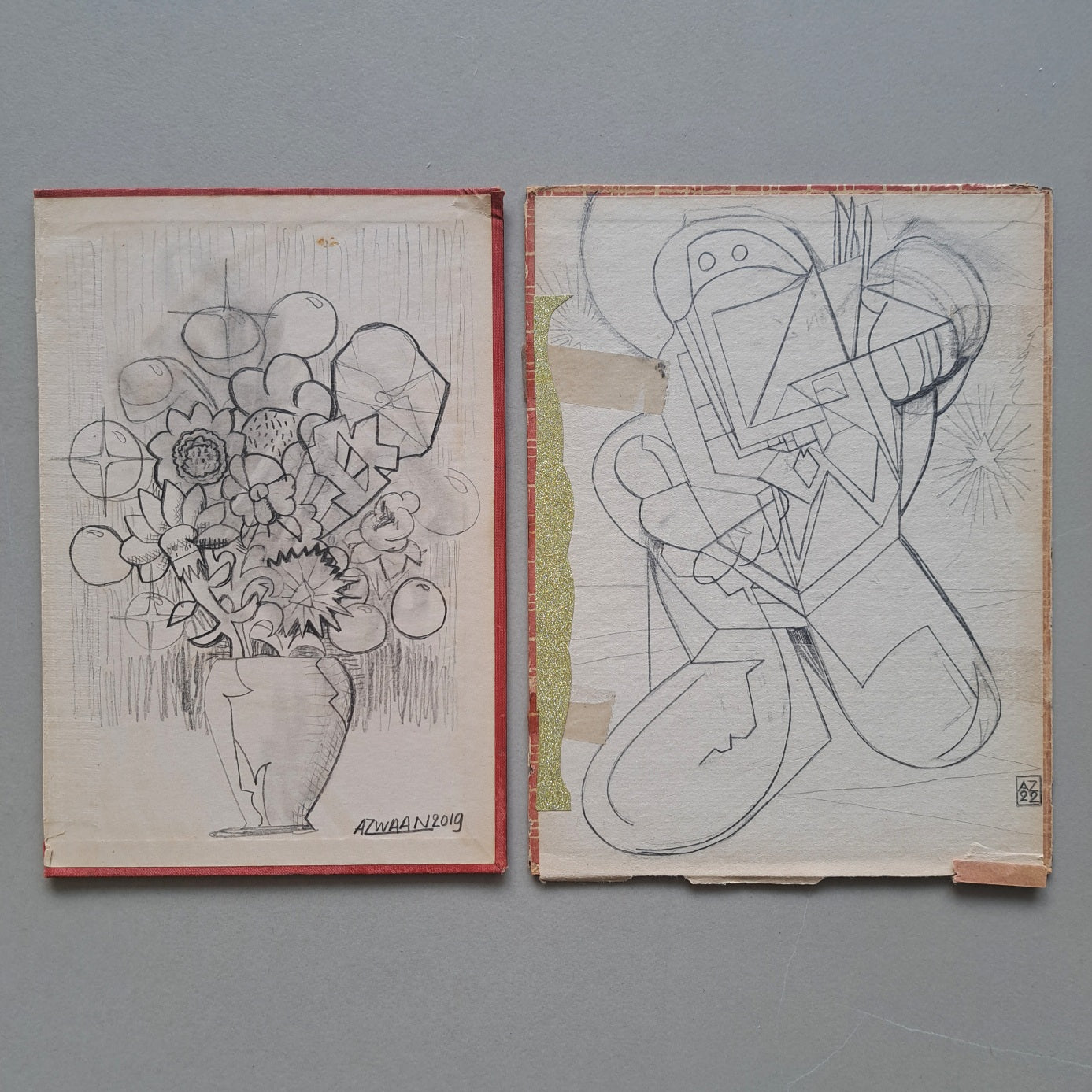 Albert Zwaan - twee tekeningen, een bloemstilleven en een robot